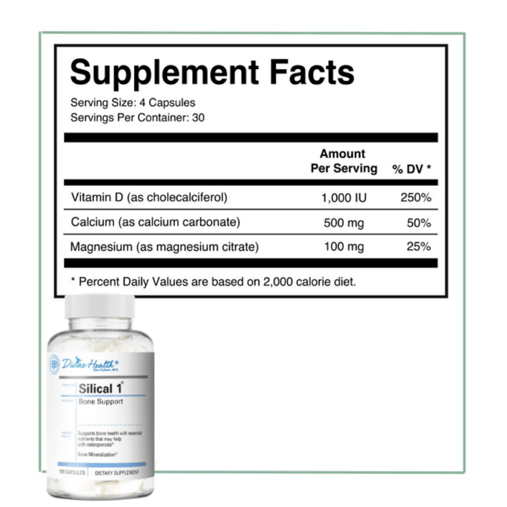 - Silical 1 – Nutrients for Bone Density and Mineral Support: Features essential nutrients that play a role in supporting bone structure. Key ingredients include Vitamin D for calcium absorption, Calcium Carbonate for bone strength, and Magnesium Citrate for bone integrity.