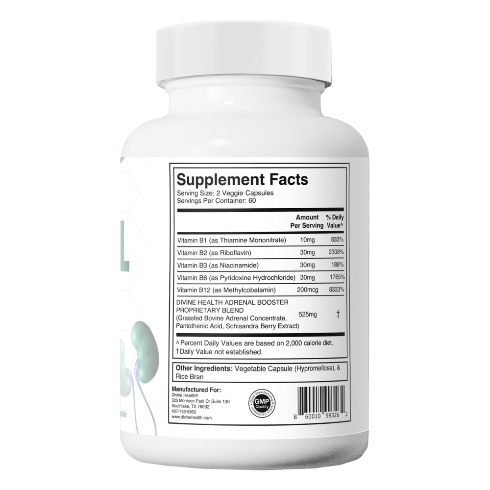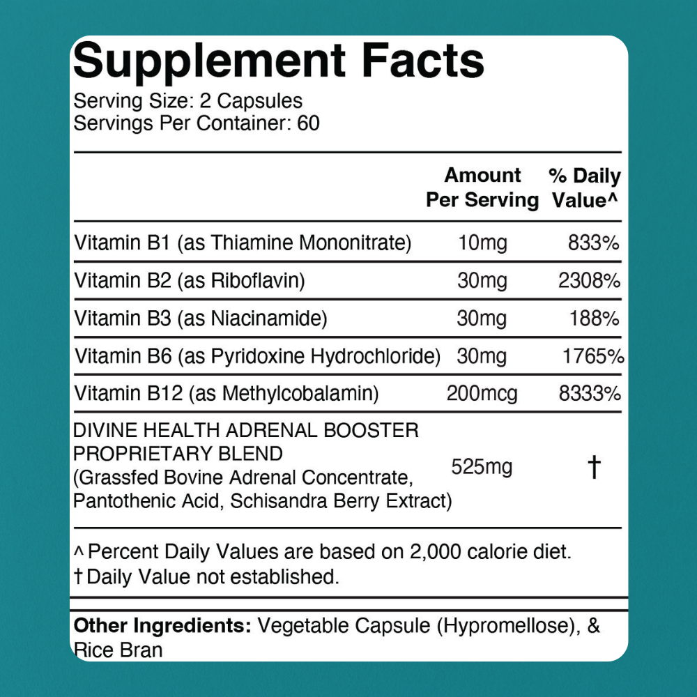 | DIVINE HEALTH ADRENAL BOOSTER PROPRIETARY BLEND (Grassfed Bovine Adrenal Concentrate, Pantothenic Acid, Schisandra Berry Extract) |