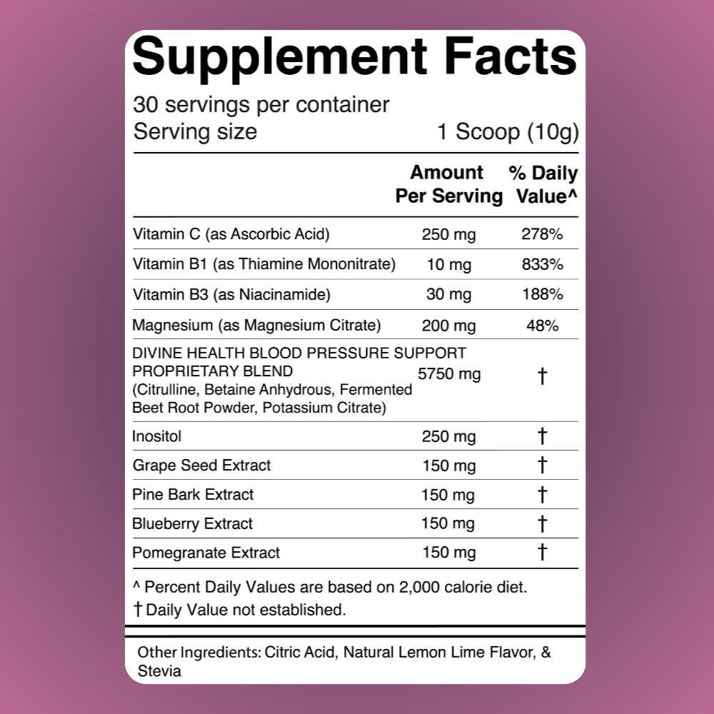 | DIVINE HEALTH BLOOD PRESSURE SUPPORT PROPRIETARY BLEND (Citrulline, Betaine Anhydrous, Fermented Beet Root Powder, Potassium Citrate) |