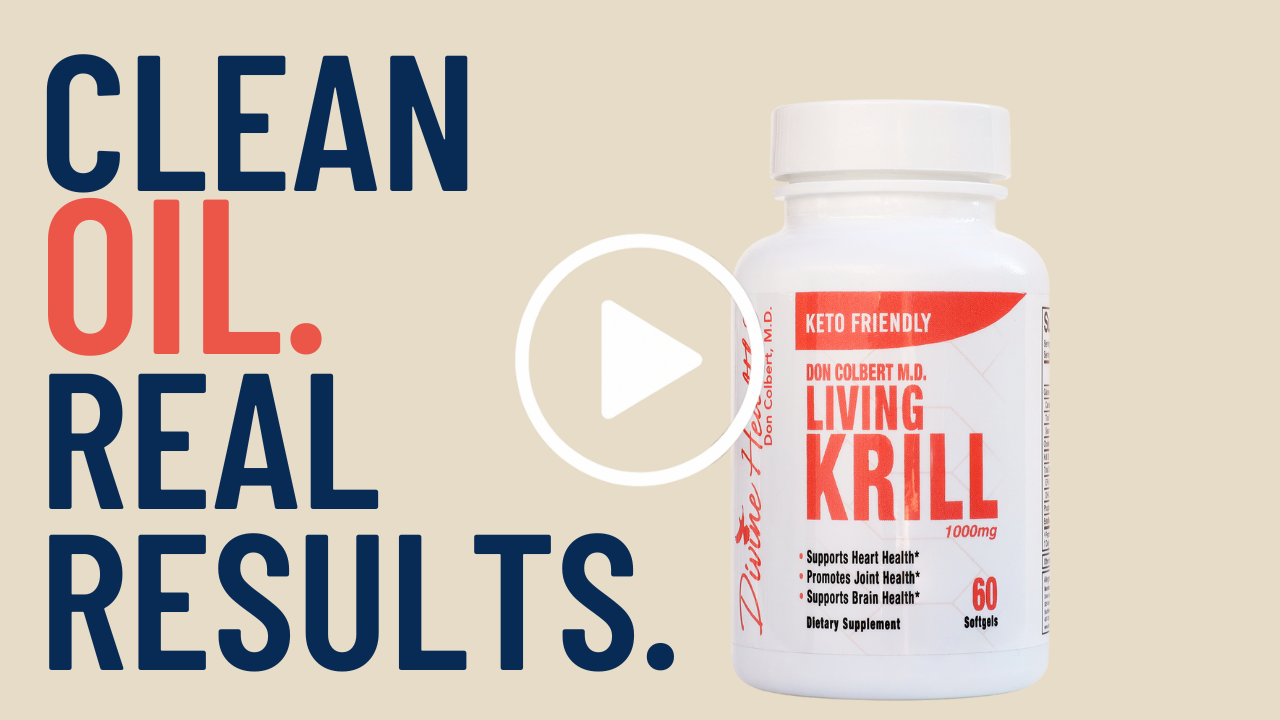 Divine Health’s Living Krill Oil by Dr. Don Colbert MD. A pure source of omega-3s with phospholipids & astaxanthin to support heart, brain, joint & immune health.